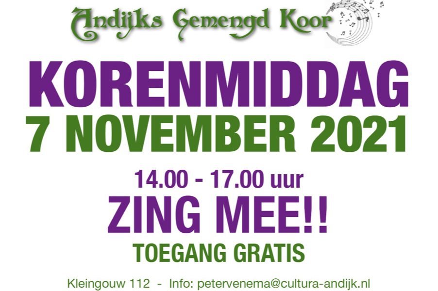 ANDIJK - Zing en eet mee op de Korenmiddag in Andijk. Zondagmiddag 7 november treden drie koren op onder leiding van Margreet Drijver: het Schoorkoor uit Hoorn, Con Brio uit Lutjebroek en het Andijks Gemengd…