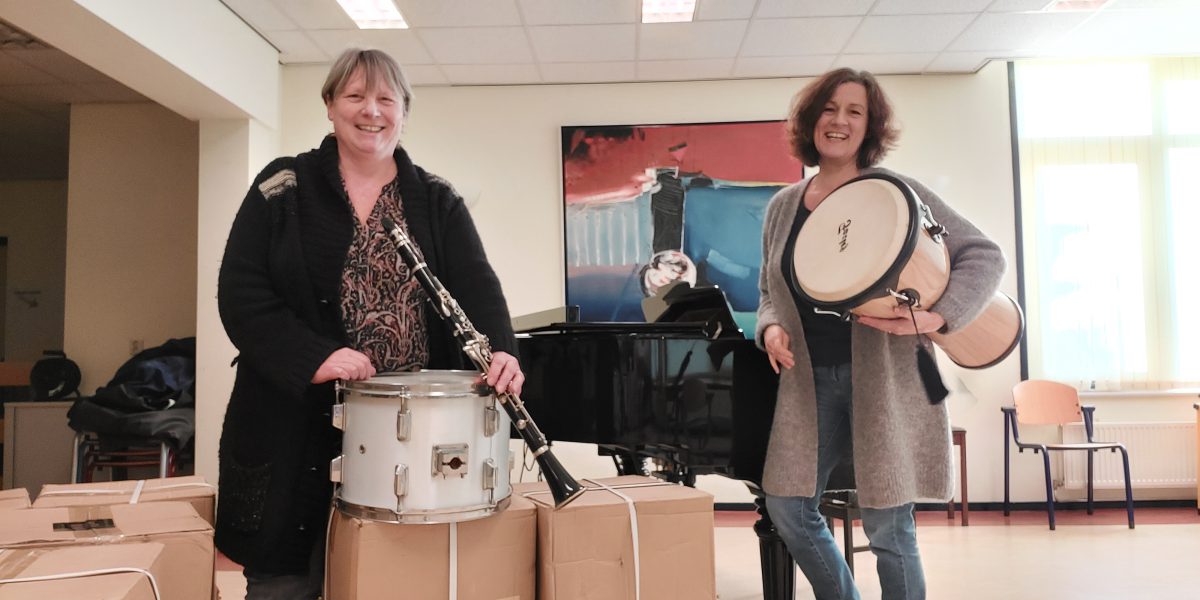 (Onderschrift foto; Pien Straesser en Gisla Bruitsman tussen de nieuw aangeschafte voorraad instrumenten voor de basisschoolprojecten)