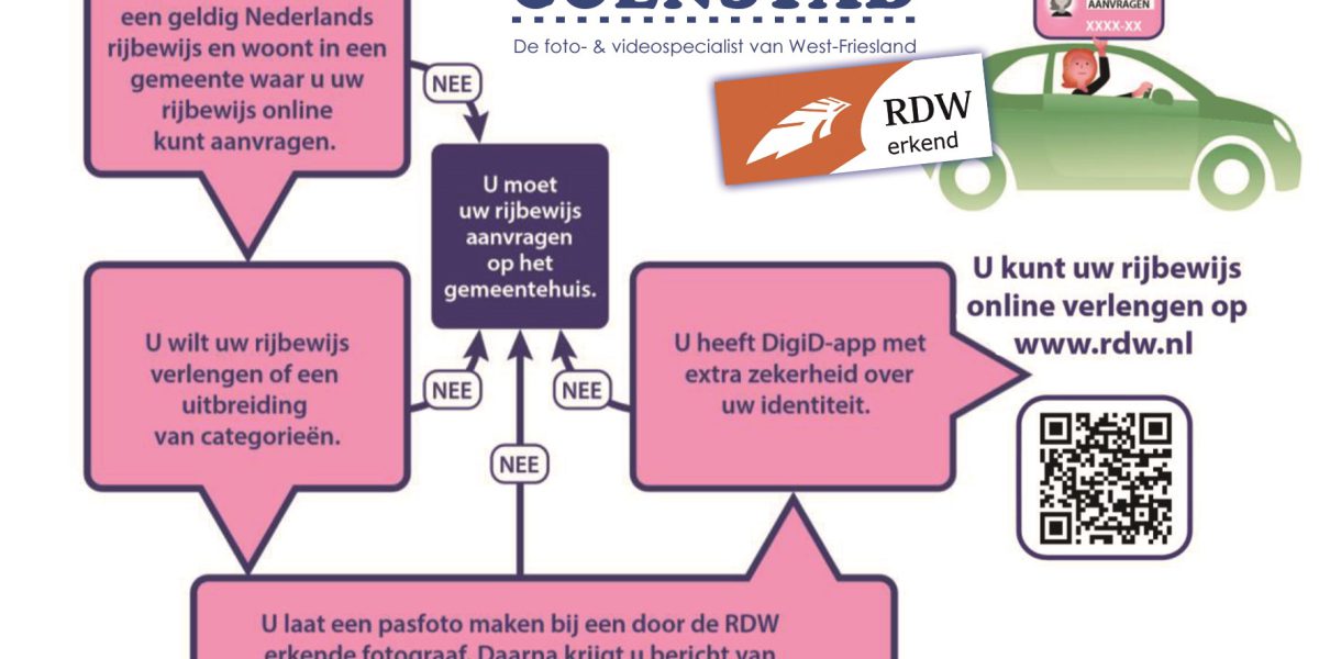 U dient hier nog wel voor bij de RDW-erkende pasfotograaf Foto Coenstad langs te gaan. Vergeet niet uw rijbewijsnummer mee te nemen. Zij maken en uploaden uw foto met uw handtekening veilig naar het RDW.